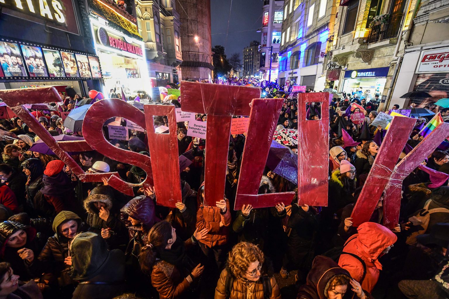 تظاهرت آلاف النساء في قلب ساحة الاستقلال وسط الضفة الأوروبية لإسطنبول اليوم الخميس وسط انتشار كثيف للشرطة للمطالبة بالحرية والمساواة، يحملن لافتات كتب عليها، “نحن اقوياء معا” و”هل ستقاومون معنا هذا الربيع؟” وهتفن شعارات بعضها معاد للحكومة.