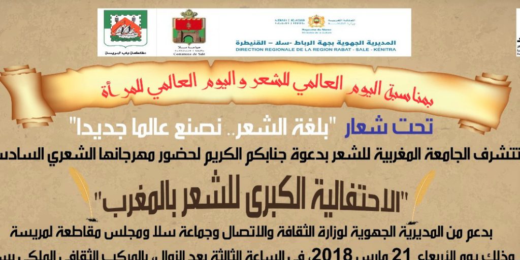 بمناسبة اليومين العالميين للشعر والمرأة، وتحت شعار ” بلغة الشعر ..نصنع عالما جديدا”، تنظم الجامعة المغربية للشعر، مهرجانها الشعري السادس، “الاحتفالية الكبرى للشعر بالغرب” وذلك يوم غد الأربعاء 21 مارس 2018، في الساعة الثالثة بعد الزوال، بالركب الثقافي الملكي بمدينة سلا.