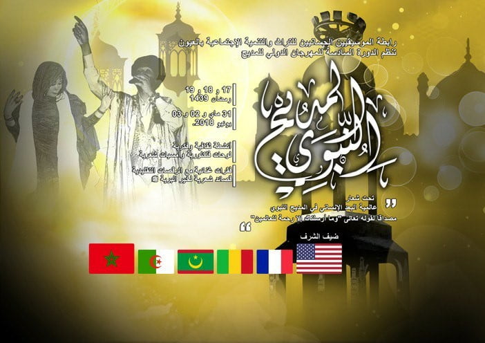 أعلنت رابطة الموسيقيين الحسانيين للتراث والتنمية الاجتماعية عن تنظيمها للمهرجان الدولي السادس للمديح النبوي، والذي تستضيفه مدينة العيون من 18 إلى 19 من شهر رمضان 1439 الموافق(من 31 ماي إلى 2 يونيو 2018) تحت شعار” عالمية البعد الإنساني في المديح النبوي”، مصداقا لقوله تعالى”وما أرسلناك إلا رحمة للعالمين” بحضور الولايات المتحدة الأمريكية كضيف شرف.