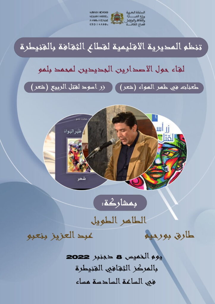 في إطار أنشطتها الثقافية والأدبية، تنظم المديرية الإقليمية لقطاع الثقافة بمدينة القنيطرة، يوم الخميس القادم ، لقاء حول الإصدارين الشعريين الجديدين للشاعر محمد بلمو: مجموعة “طعنات في ظهر الهواء” الصادرة ضمن منشورات جمعية الفكر التشكيلي بالرباط، ومجموعة “زرٌّ أسود لقتل الربيع” الصادرة عن دار مقاربات للنشر بفاس.