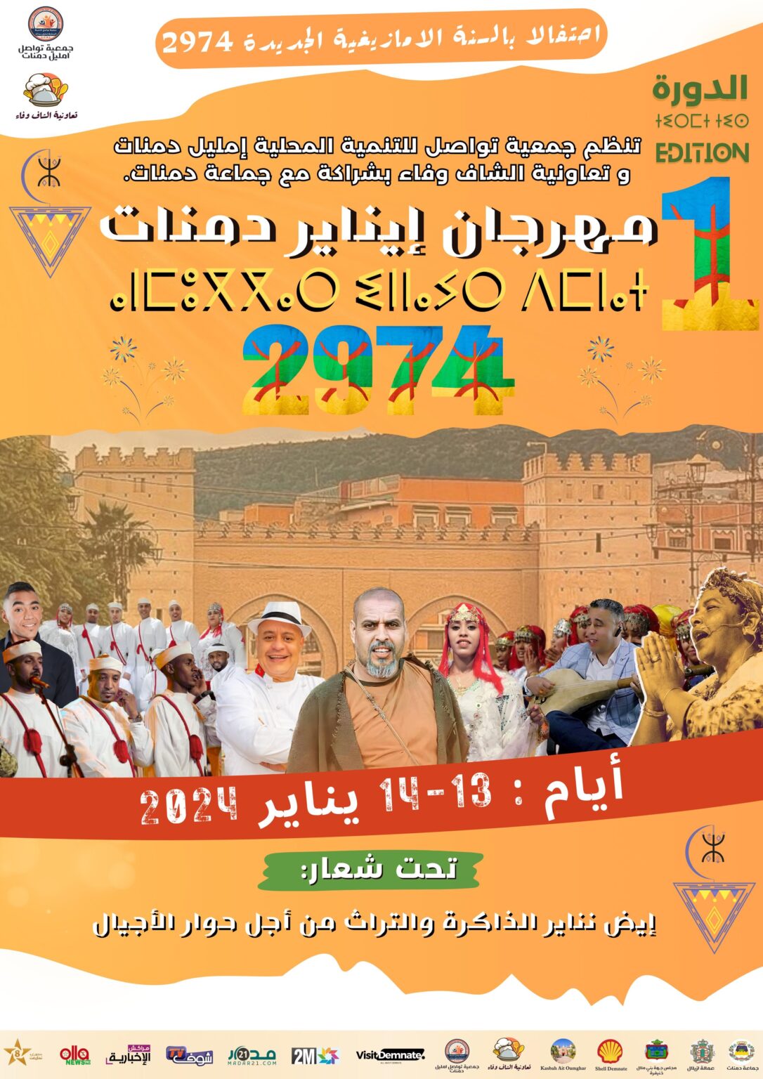 احتفالا بالسنة الأمازيغية الجديدة 2974 و تحت شعار إيض نناير الذاكرة و التراث من أجل حوار الأجيال تنظم جمعية تواصل للتنمية المحلية إمليل دمنات و تعاونية الشاف وفا بشراكة مع جماعة دمنات مهرجان إيناير دمنات في نسخته الأولى و ذلك أيام 13 و 14 من يناير الحالي .