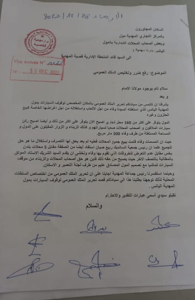 وفي هذا السياق، التمست الساكنة والتجار من خلال شكاية موجهة إلى الجهات المسؤولة لرفع الضرر وتحرير الملك العمومي، خاصة وأن الفضاء المستغل لألعاب الأطفال يفتقر لشروط السلامة والأمان، علاوة على أن المنظر العام للمكان يعرف مساسا بالتصميم العام للمول سواء من حيث جمالية المكان، حيث أصبح محاجا للباعة المتجولين وبائعين المأكولات السريعة وكذا وجهة للنساء اللواتي يقمن بتزيين الأيادي بالحناء، مما يخلق الإزعاج للساكنة التي اقتنت منازلها في منطقة راقية بأثمنة باهضة من أجل البحث عن فضاء نظيف يحتوي على مرفق لسياراتهم وهادئ، إلا أنهم ووجهوا بسيدة مستقوية وتعتبر نفسها فوق القانون ، الأمر الذي يجعل الساكنة تطرح العديد من الأسئلة التي لم يجدون لها أسئلة ، فرفضوا الظلم وتوجهوا بشكاية إلى السيد قائد الملحقة الادارية قصبة مهدية بتاريخ 28/12/2022، ومثيلتها إلى السيد رئيس المجلس الجماعي بمهدية الذي استجاب لطلب الساكنة مشكورا بإصدار قرار الإلغاء وسحب الإذن باستغلال المكان كفضاء للالعاب البلاستيكية للأطفال ، والموجه إلى السيد قائد الملحقة الادارية تحت إشراف السيد باشا مدينة مهدية قصد اخبارها بمضمن القرار واجبارها على الاخذ به على وجه السرعة، غير ان القرار بكل تعنت قوبل بالرفض واللامبالاة والاستمرار في مواصلة نشاطها الذي يعتبر حاليا غير مرخص به وتلعب بارواح ابرياء سيكونون ضحية.
