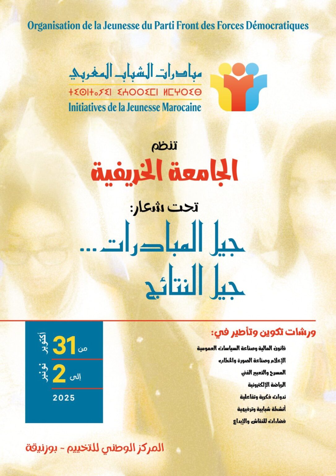 أعلنت مبادرات الشباب المغربي شبيبة حزب جبهة القوى الديمقراطية عن تنظيم جامعتها الخريفية لهذه السنة بمدينة بوزنيقة تحت شعار: “جيل المبادرات… جيل النتائج” وذلك أيام 31 أكتوبر و1 و2 نونبر 2025، بالمركز الوطني للتخييم ببوزنيقة، حسب ما أفاد به بلاغ لإدارة الجامعة، تحصلت الجريدة على نسخة منه.